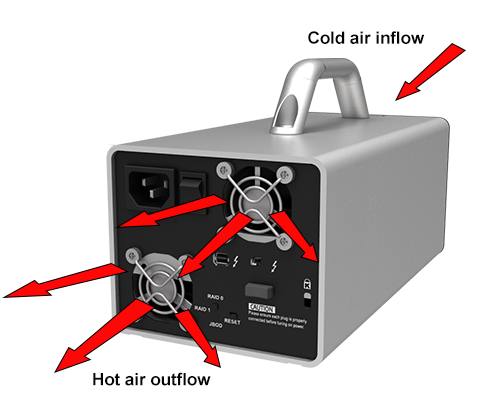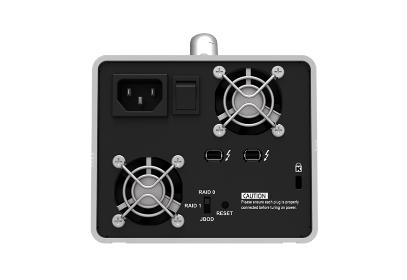 DX4-TB2's two 4 cm silent fan helps dissipating out the heat generated from HDDs/SSDs efficiently and always keep them with low working environment which helps their life cycle.