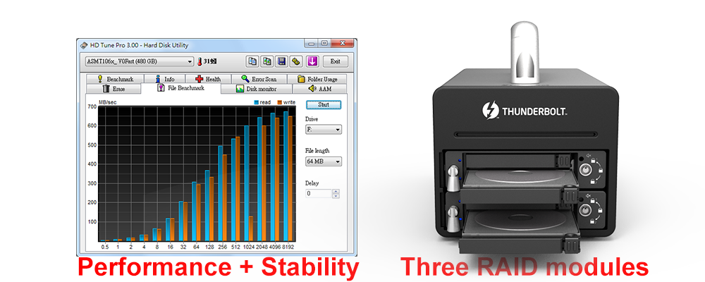 DX4-TB2 could still protect your data while there are two defective HDDs/SSDs at the same time just like what RAID 1 gives you. And also, its data transfer performance is equivalent to what RAID 0 gives you too.