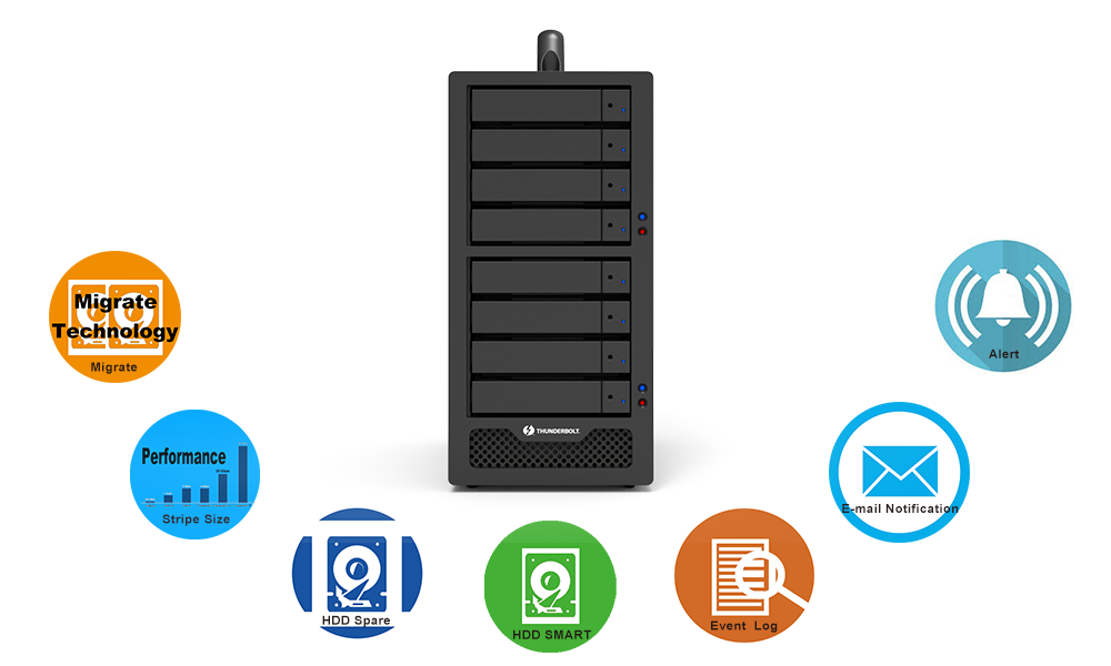 The Marvel MSU Utility could help monitoring the RAID status while your SR8-TB2 is working, and alert you thru beeping sound from a loud buzzer, and sending you a warning message thru e-mail system. MSU also records all the product status in detailed and helps testing your HDD quality thru its built-in S.M.A.R.T. testing software for you.