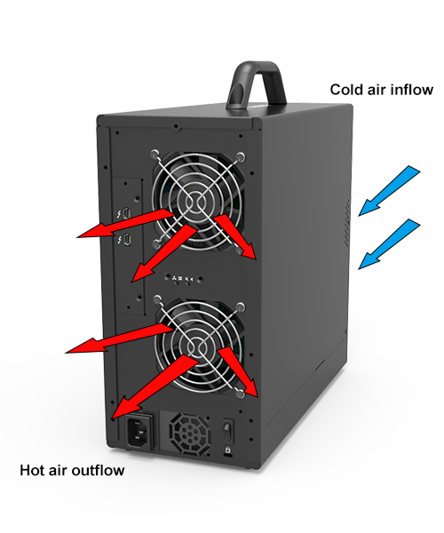 Rigid mechanical structure with two 8 cm quiet fans to get rid of the heat efficiently