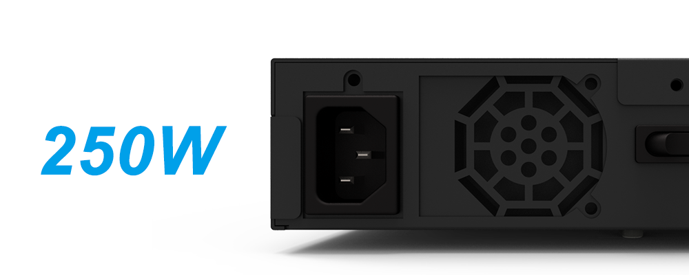 DR8M-TB3 uses conform with safety regulation certified 250W power supply unit which provides a stable and high efficient power output and definitely satisfies the big power consumption from all 8 HDDs.