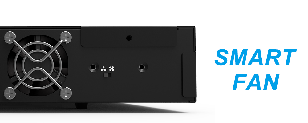 DR8M-TB3 is also designed with the MCU feature which monitors and helps improving its in-chassis system temperature. While the system temperature rises up to 55 degree-C (131 degree-F), MCU will bump up the 4 cm fans with full speed; and once system temperature goes down to 50 degree-C (122 degree-F), you could manually adjust fan switch on the rear, MCU would reduce the fan speed down to a half speed for a better green user environment from a less fan noise and lower power consumption.