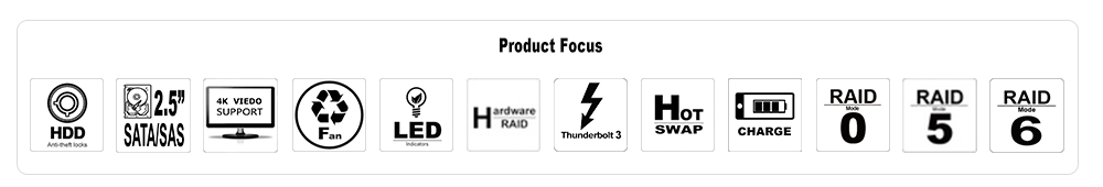 DR8M-TB3 supports Thunderbolt 3.0 (TB3) interface for an extreme high data transfer speed. And both of the two TB3 ports are equipped with a up to 40Gb/s data transfer rate which is 4 times faster than USB 3.1 Gen 2 ,2 times faster than Thunderbolt 2.0 and even 8 times than SATA III interface. You could definitely use it to play your 4K high-resolution films with no any lagging hassle. Thunderbolt 3.0 interface not only brings you this high data transfer rate advantage, it also let you chain maximum up to 6 products (or other compatible storage products).