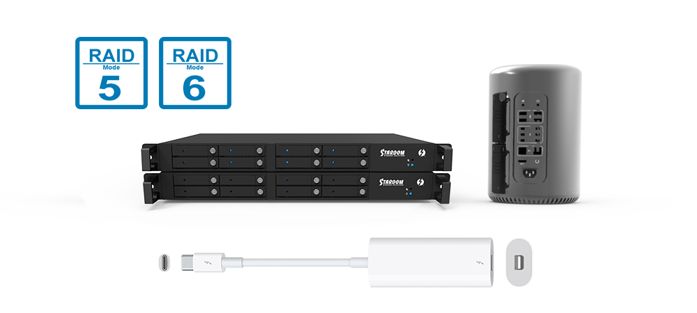 You can also easily extend your legacy device with Thunderbolt 3 (USB-C) to Thunderbolt 2 adapter, which connects to a Mac Pro device with Thunderbolt 2 interface. Your Mac Pro Cylinder could connect to one DR8M-TB3 and chain to more DR8M-TB3 products for a huge memory storage capacity thru its high performance Thunderbolt 3 interface. You could definitely enjoy its huge memory capacity together with the RAID 5 or even RAID 6 setting for an excellent data protection.
