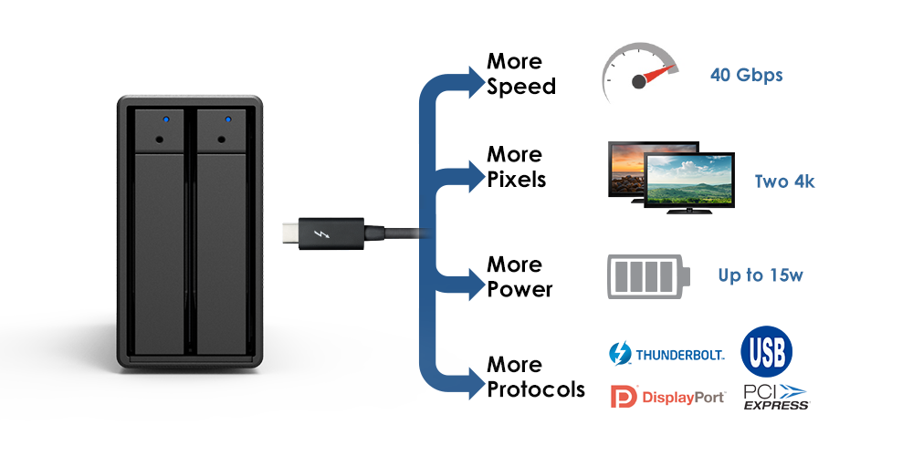 ST2-TB3 supports Thunderbolt™ 3.0 (TB3) interface for an extreme high data transfer speed. And both of the two TB3 ports are equipped with a up to 40Gb/s data transfer rate which is 4 times faster than USB 3.1 Gen 2 ,2 times faster than Thunderbolt™ 2.0 and even 8 times than SATA III interface. You could definitely use it to play your 4K high-resolution films with no any lagging hassle. Thunderbolt™ 3.0 interface not only brings you this high data transfer rate advantage, it also let you chain maximum up to 6 products (or other compatible storage products).