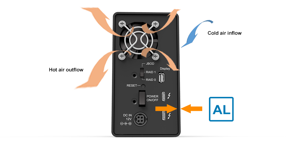 ST2-TB3's solid chassis is made by a thickness aluminum-alloy plate. And its aluminum housing and the 4 cm FANs (with safe FAN GUARDs) really help an efficient heat dissipation for your long time use.