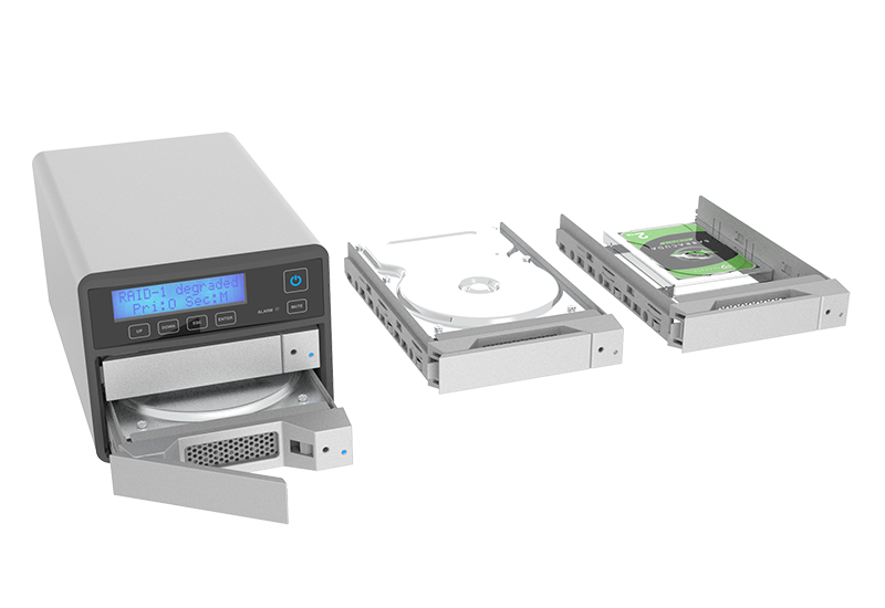 The SR2-B31 comes with an advanced LCD Status Screen for effortless RAID configuration management. This clear, user-friendly display provides real-time information about your RAID setup and drive status, simplifying system monitoring and potential issue identification. If you’re using RAID 0 for speed and capacity or RAID 1 for data redundancy, this feature ensures you stay informed and in control of your data storage at all times. With its combination of functionality and sophistication, the LCD Status Screen makes storage management as intuitive as it gets.