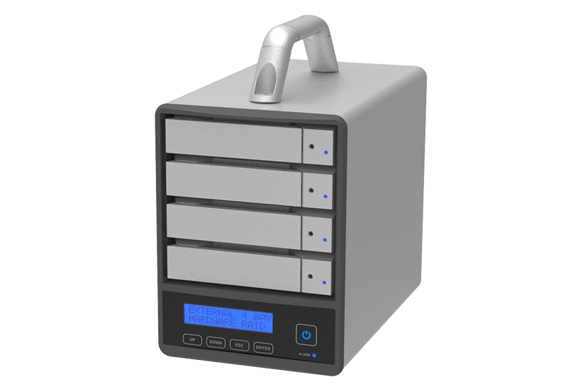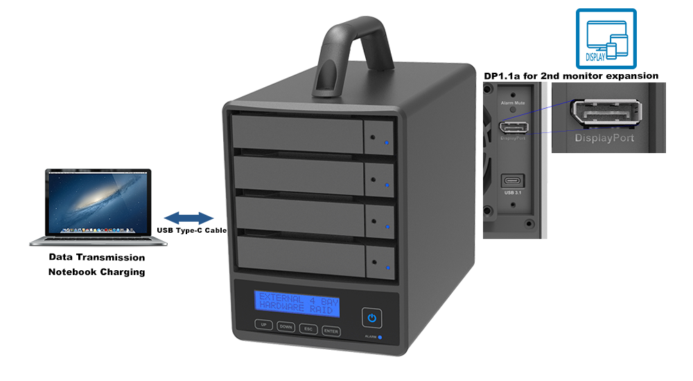 A robust 4-BAY Hardware RAID5 storage solution, designed for both 2.5" & 3.5" SATA III HDD/SSD. Features include 24W USB Power Delivery, a Display Port (DP1.1a) for dual monitor setup, and USB 3.2 compatibility for Type-C. Enhanced features with hot-swappable drives, an intuitive LCM display, touch-button controls and unique feature of charge back feature.