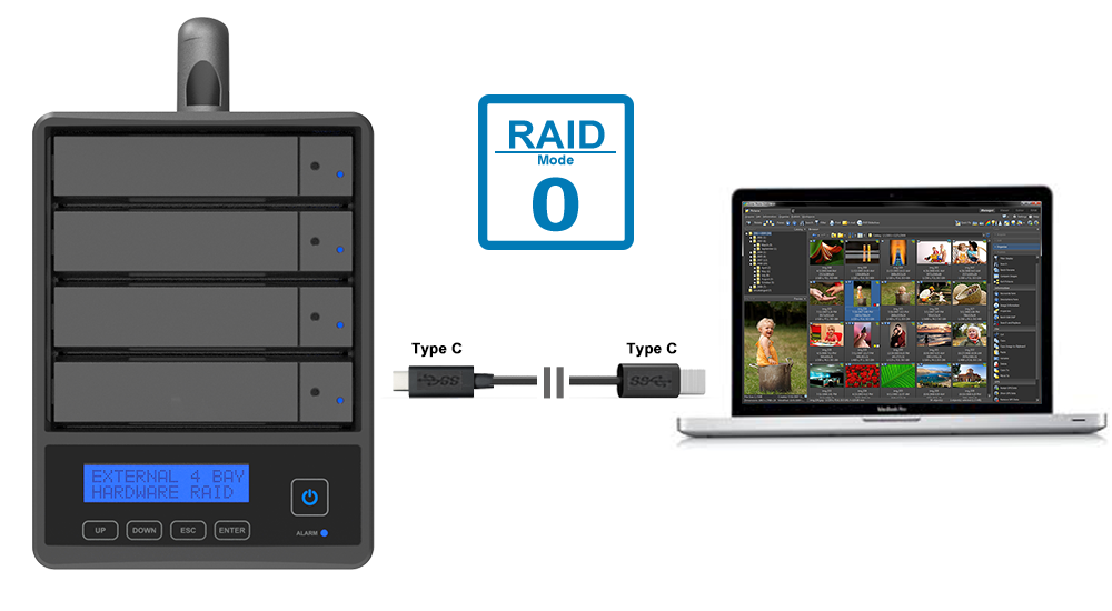 | Storage Mode | JBOD - Independent Mode RAID 0 - Speed Mode RAID 5 - Safe Mode |