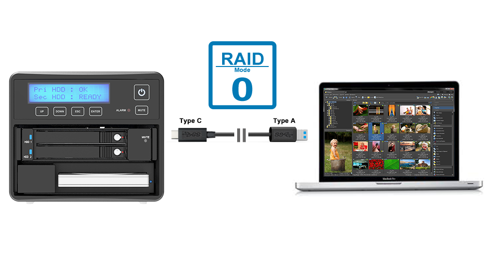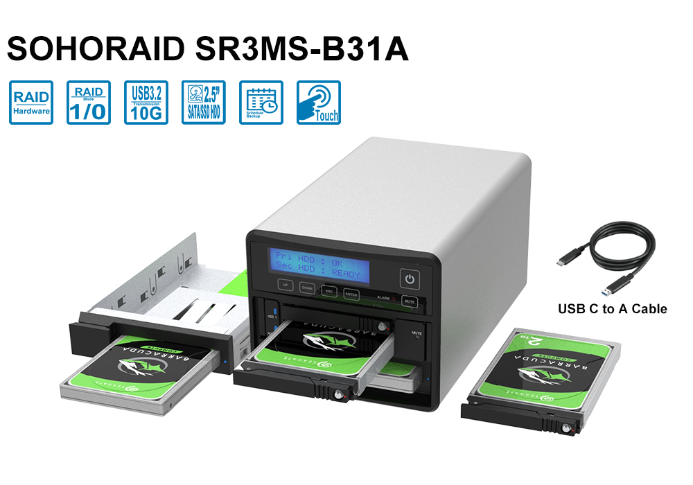 SR3MS-B31A has an ultra-fast Type-C to A cable. Users can connect SR3MS-B31A to any host device that has USB Type-A interface. Using RAID 0 mode and use backup on demand function, the SR3MS-B31A can be created an entire photography studio to import or backup thousands of RAW images at any time, and help users to complete various photo editing quickly.