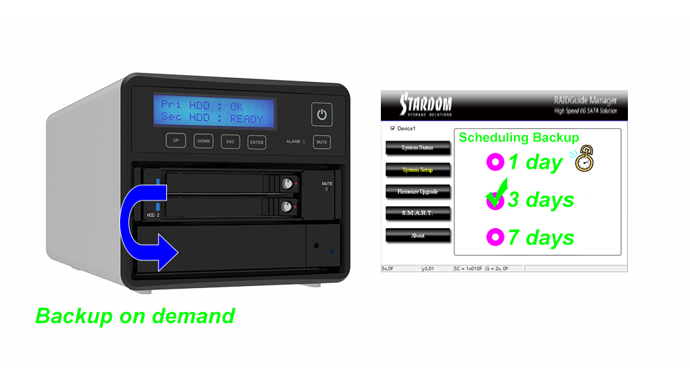 Raid 1 Mode + Backup On Demand, use with Server to backup the important data