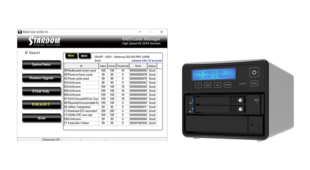 SR3MSB-BA31, in addition to the back light screen that can display the module status, for Windows users, a software RAIDGuide Manager monitoring program is also provided. It allows users to understand the RAID module and hard disk status more directly through the monitoring program. Even better, after setting the monitoring program, it will take the initiative to send letters to users when the hard disk fails. This instant notification allows users to be aware of the situation as soon as possible to remedy the situation faster.