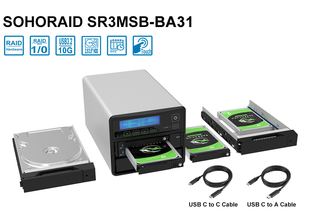 | Package Accessories | *SR3MSB-BA31 x 1 (with removable 2 x 2.5" HDD/SSD Tray + 1 x 2.5"/3.5" HDD/SSD Tray) * USB 3.2 Gen 2 (Type-C to Type-C) Cable x 1 * USB 3.2 Gen 2 (Type-C to Type-A) Cable x 1 * Power Cord x1 * Accessory Kit * Quick Installation Guide x1 |