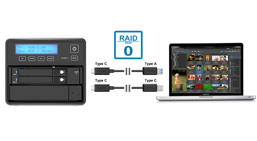 SR3MSB-BA31 has an ultra-fast Type-C to C/A cable. Users can connect SR3MSB-BA31 to any host device that has USB Type-C/A interface. Using RAID 0 mode and use backup on demand function, the SR3MSB-BA31 can be created an entire photography studio to import or backup thousands of RAW images at any time, and help users to complete various photo editing quickly.