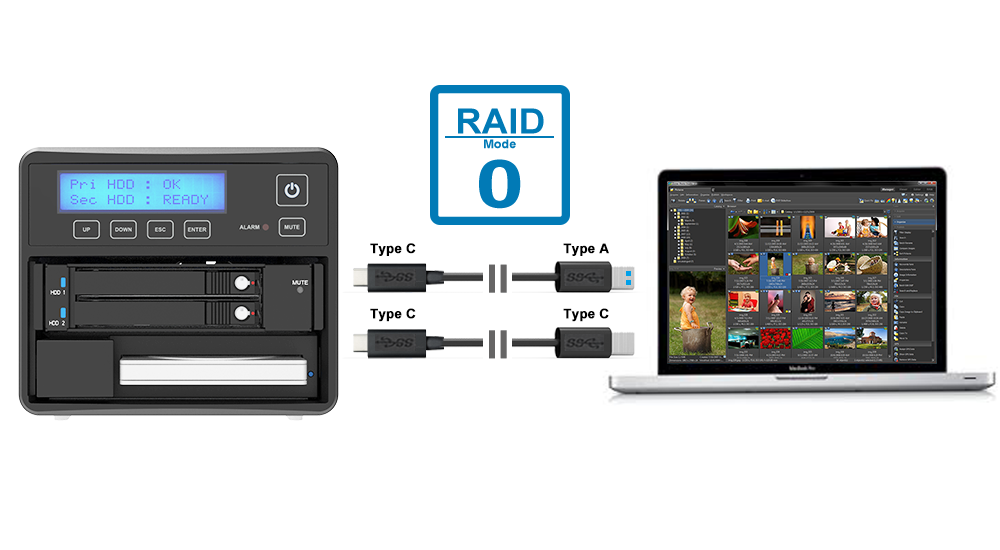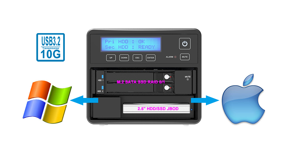 ● RAID 0, RAID 1, and JBOD Support: Customize your storage setup for speed (RAID 0), data redundancy (RAID 1), or flexible storage pooling (JBOD).