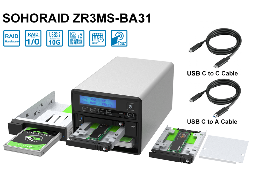 The ZR3MS-BA31 USB 3.2 Type-C Storage with Dual-M.2 SATA SSD RAID and JBOD SSD Extractor is a versatile device that can be used in a variety of applications, owing to its high-speed data transfer, flexible storage options, and robust features. Here are some possible applications: