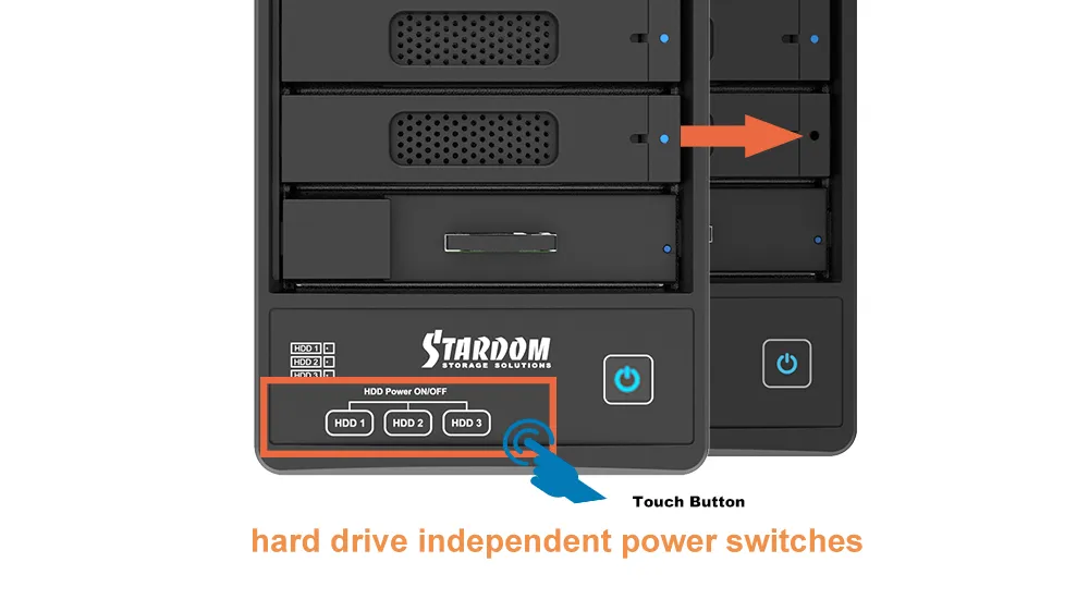 Supports USB 3.2 gen 2 Type-C, drive hot swappable, LED indicators, Touch Button and 3 hard drive independent power switches