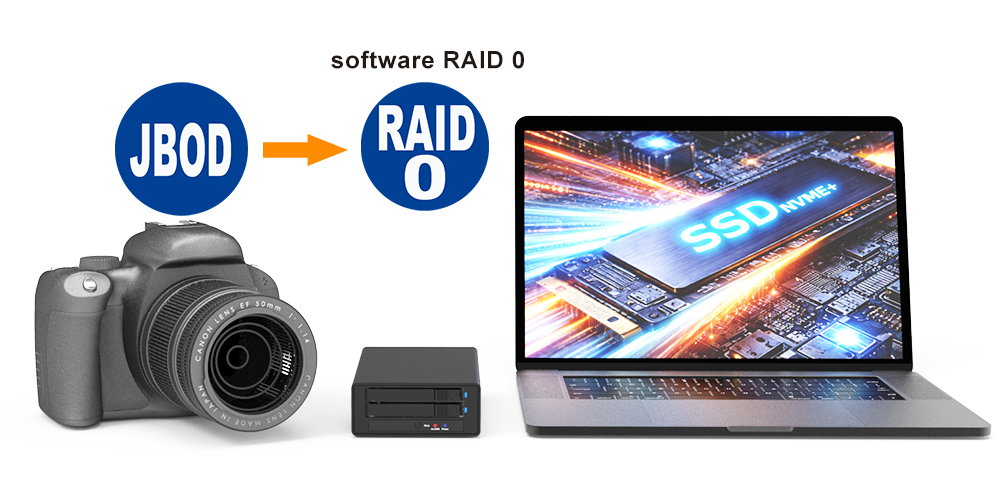 ● JBOD (Independent Mode): two SSDs operate as separate volumes (no RAID)