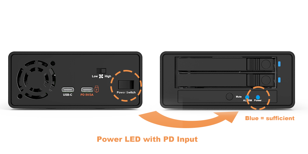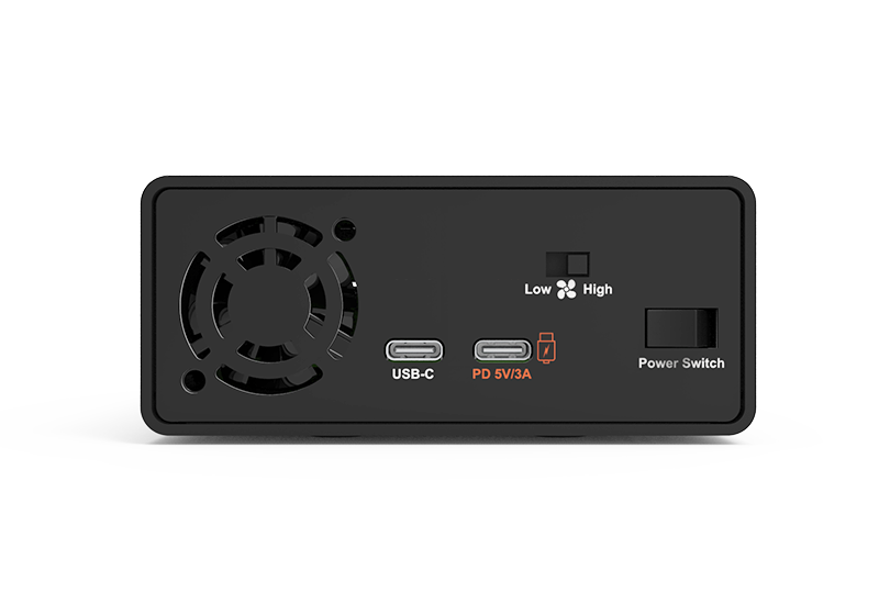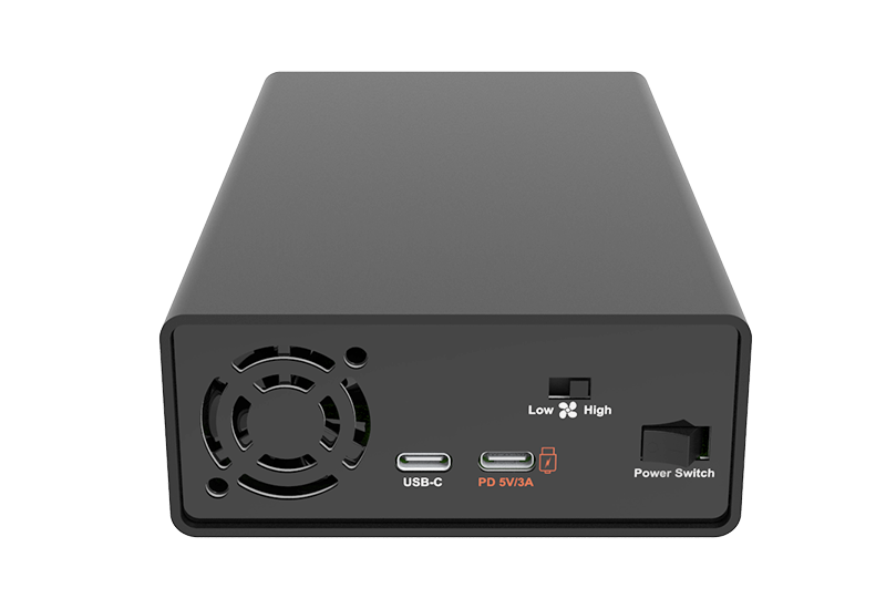US2-B4 uses USB-C PD (5V/3A) input to keep operation stable under dual-NVMe and sustained workloads.