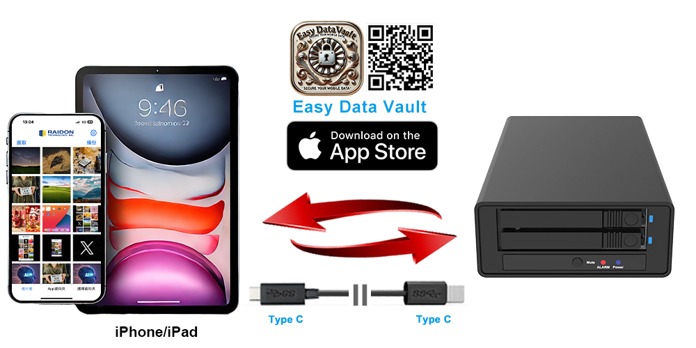 With tool-free, removable SSD trays, active cooling, and hardware alarms (temperature / fan failure), the US2-B4 is optimized for sustained workloads. For mobile workflows, pairing with Easy Data Vault enables offline photo/video backup to external storage from USB-C iPhone/iPad—no cloud and no internet required.
