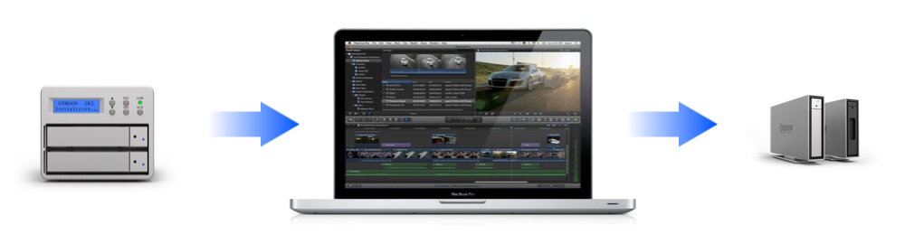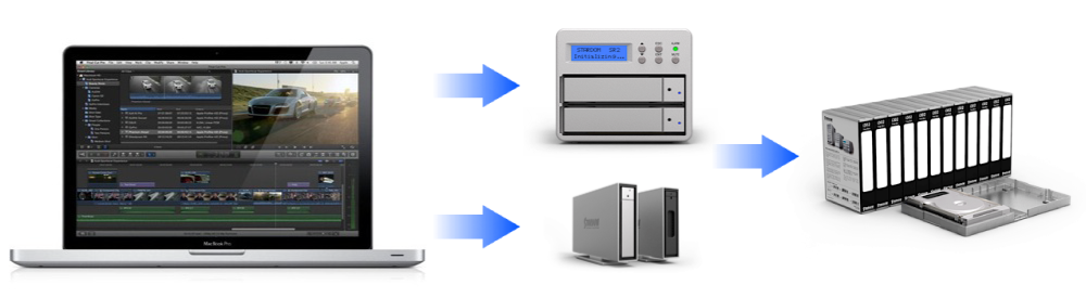 To archive and make an redundant offsite copy, pull out one or both drives from SR2 to our anti-static drive module box. Each drive contains complete project file and can be read and retrieve as a single volume. Another option is to copy to i302 and archive the drive using our drive module box.