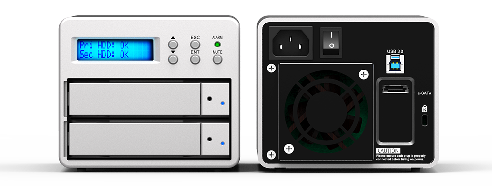 Encased in a thick aluminum enclosure and large size, low noise fan to keep hard drives healthy and dissipate heat from the RAID.
