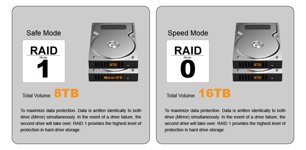 High reliable RAID 1 (Mirrored) offers ultimate protection beyond RAID level. All data are written simultaneously to both drives. If one drive should fail, your data is still accessible and the second drive will take over.