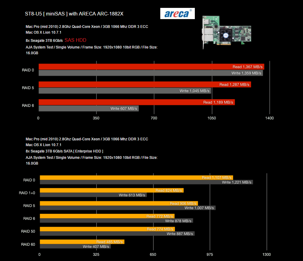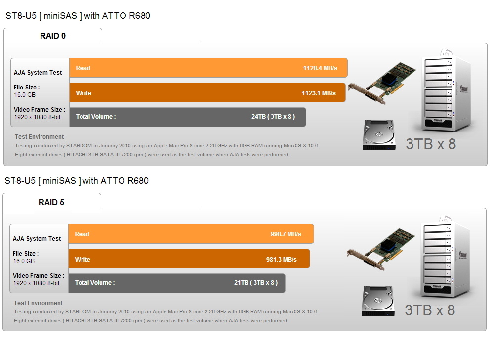 When used with the ATTO R680 PCIe x8 RAID controller a ST8-U5 with eight 7200 RPM, SATA II drives in RAID 5 protected mode achieves close to 1000MB/sec performance and supports two simultaneous streams of uncompressed 10-bit HD or a single 2K DPX sequence.