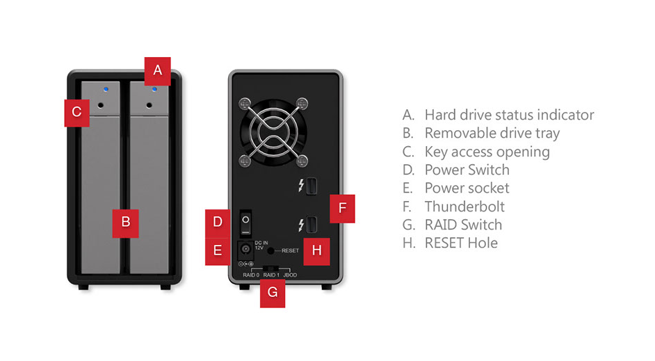 | Package Accessories | * ST2-TB Product Unit x1(Removable Tray x2) * Thunderbolt Cable x 1 * AC to DC Power Adapter x 1 * Power Cable x 1 * Accessory kit * Quick Installation Guide x1 |